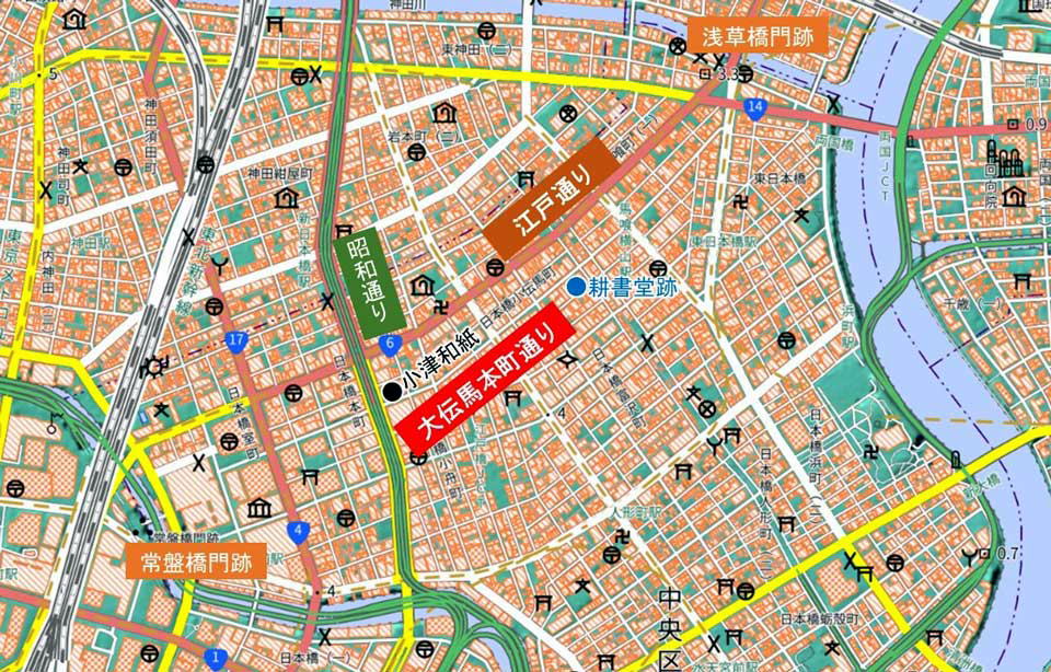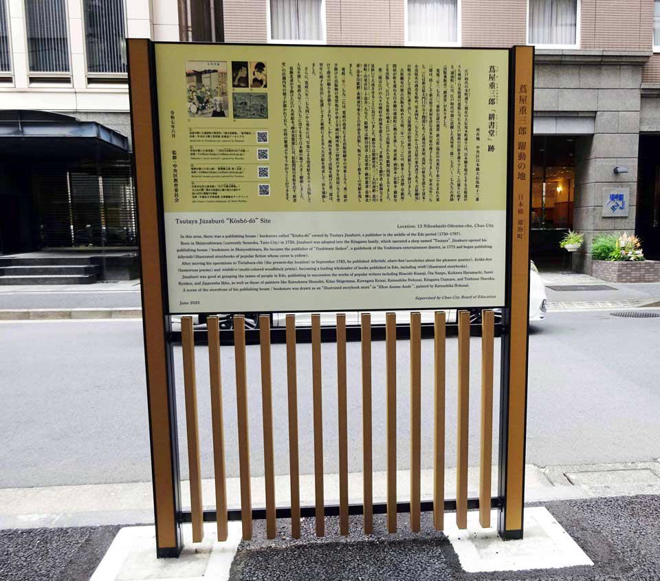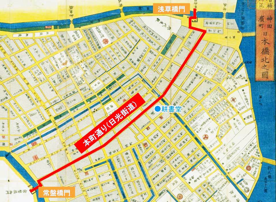 江戸時代の本町通り(現・大伝馬本町通り)は日本橋を起点とする五街道のうち、奥州・日光街道の道筋に当たる江戸屈指の目抜き通りでした。この通りに面する通油(あぶら)町には江戸時代に中期に活躍した蔦屋(つたや)重三郎(1750~1797)の書肆(しょし)(出版・販売店)「耕書堂」がありました。寛延三年(1750)幕府公認の遊郭・新吉原で生まれた重三郎は幼くして新吉原で茶屋を営む喜多川家の養子となりました。安永元年(1772)には、新吉原大門口の五十間道にあった義兄の茶屋「蔦屋」の軒先を借りて、貸本・小売取次の商売を始め、安永四年(1775)からは、吉原の案内書である「吉原細見」の版元として出版に乗り出し、吉原関連の絵草紙や黄表紙なども手掛けました。「吉原細見」の独占出版を始めた天明三年(1783)には、数多くの書肆・草紙屋問屋が軒を連ねる日本橋の通油町に拠点を移し、黄表紙・洒落本、狂歌本、錦絵などを出版して、江戸で出版された草紙を扱う有数の地本問屋となりました。重三郎は、江戸の人々の嗜好や時流を捉えること、才能のある戯作者・絵師などを見抜いて大成させることに長(た)けていました。戯作では、朋誠堂喜三二、太田南畝(なんぼ)、恋川春町、山東京伝、十返舎一九など、絵師では勝川春章、北尾重政、葛飾北斎、喜多川歌麿、東洲斎写楽などの作品を出版し、版元として、数多くの実績を残しました。