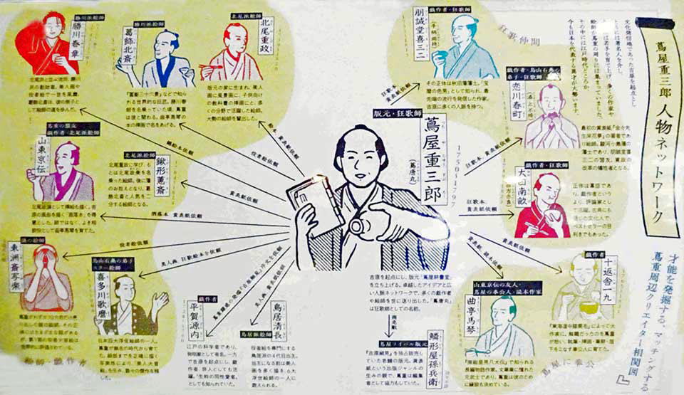 そこでは、当時の庶民の生活が判るように、興味をそそられるように陳列されています。また、蔦屋重三郎と商売、取引上の交友を重ねた出版物の挿絵や錦絵の制作者さらに、作家・文筆家、版木師・彫刻師・摺師、紙商・筆墨商役者・知識人・文化人そして顧客・パトロンたちも紹介されています。 |
